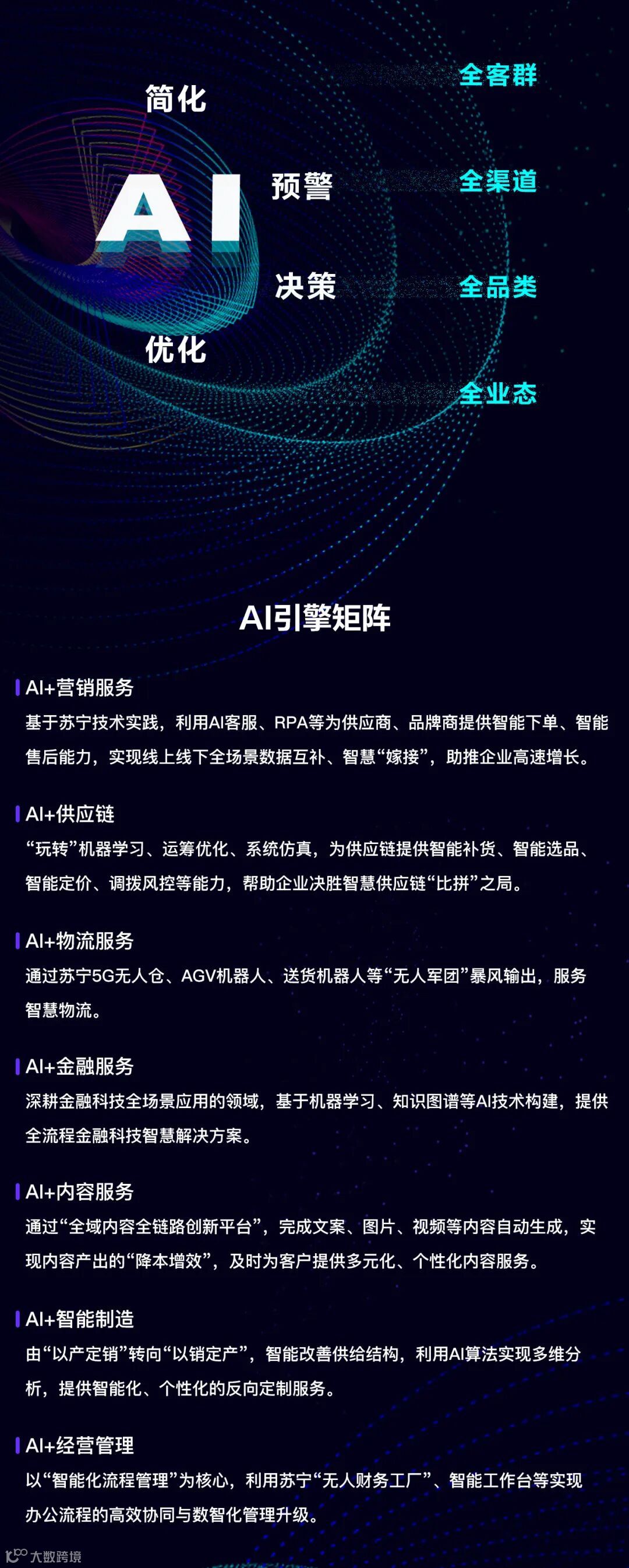 随着“新基建”提速,人工智能迎来发展的重大机遇。在2020世界人工智能大会云端峰会上,苏宁首次对外公布智慧零售AI引擎——“四全四爱(AI)”,以全链路智慧化运营能力开放赋能,为未来AI家园的打造带来无限可能。在“四全四爱(AI)”体系中,“AI+营销服务”“AI+供应链”“AI+物流服务”“AI+金融服务”“AI+内容服务”“AI+智能制造”“AI+经营管理”共同构成了全链路、立体化的AI引擎,为苏宁发力人工智能领域提供了重要支撑。