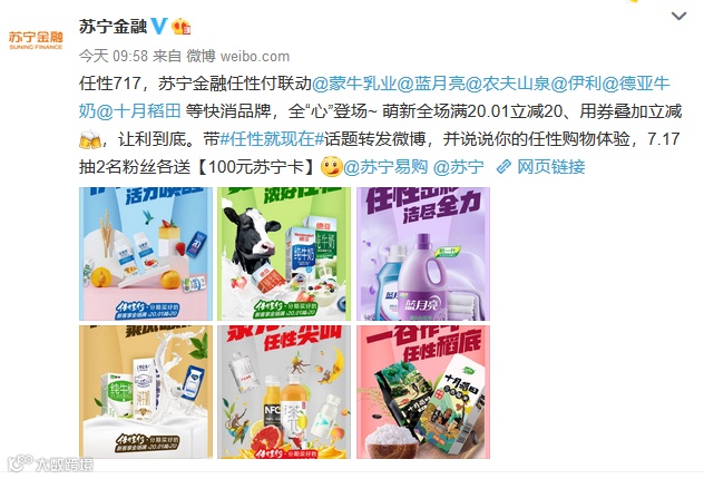 7月,苏宁金融旗下任性付迎来品牌升级,全新LOGO形象、全心服务理念,只为让生活更“任性”一点。与此同时,任性付也在这个夏天迎来了与蒙牛、伊利、蓝月亮、农夫等快消巨头的品牌联动与活动落地,任性717,让利到底。打开苏宁金融APP,进入免息商城页面,就可以参与此次“任性大牌”立减活动。