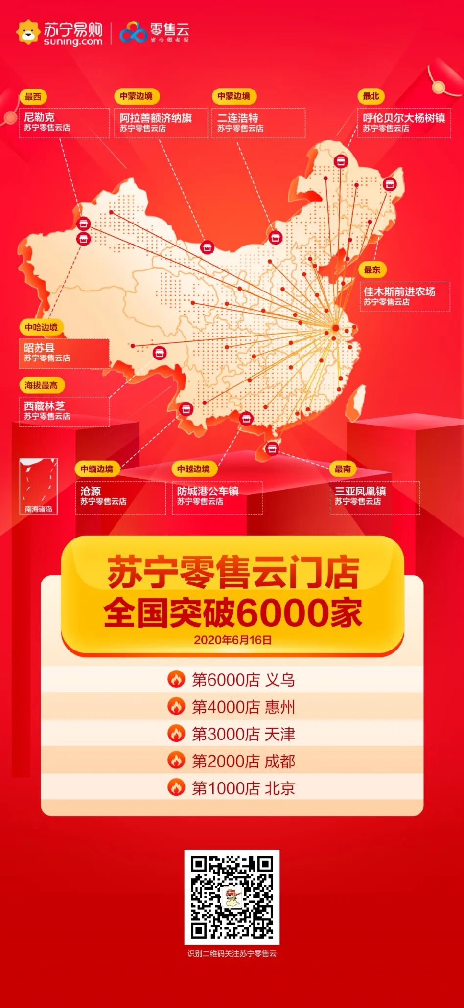 6月16日,在“世界小商品中心”浙江义乌的一个小镇商场,苏宁零售云全国第6000店——义乌佛堂镇零售云店盛大开业,这标志着零售云在后疫情时代,继续进入由1到N的快速裂变期。3年的时间,零售云实现了6000店的突破。