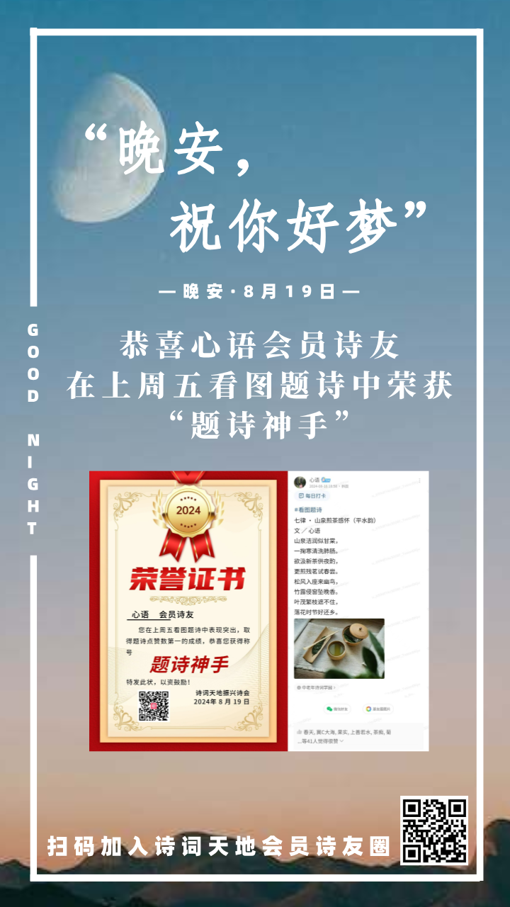 晚安海报丨恭喜心语会员诗友,在上周五看图题诗中荣获“题诗神手”!