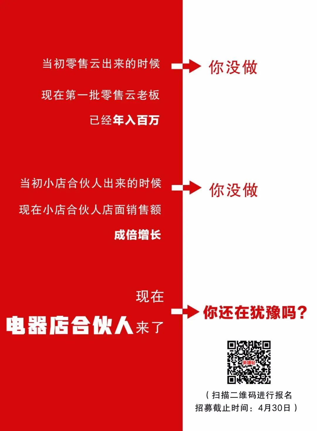 现在,电器店合伙人已经在全国全面铺开,到6月份会有超过300家门店完成合伙开业,这些店的店长都将成为自己的老板,对自己的店面付出更多精力的同时,也将获得更丰厚的回报。