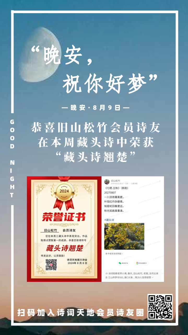 晚安海报丨恭喜旧山松竹会员诗友,在本周藏头诗中荣获“藏头诗翘楚”!