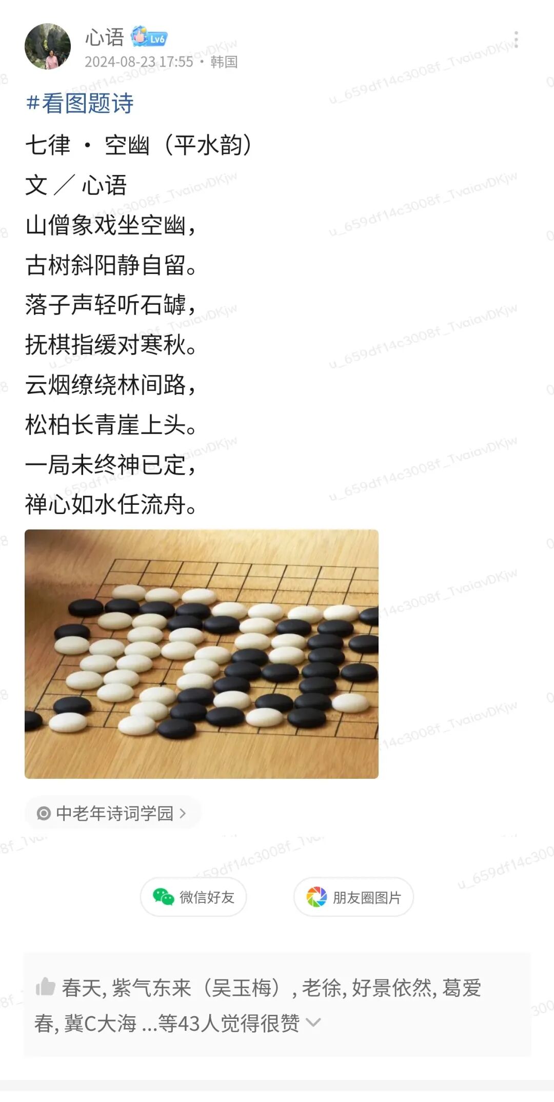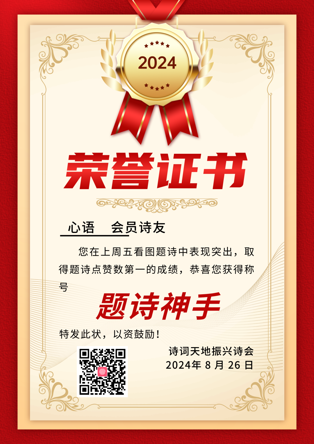 恭喜 心语 会员诗友,在上周五看图题诗取得点赞数第一的成绩,获得称号“题诗神手“。