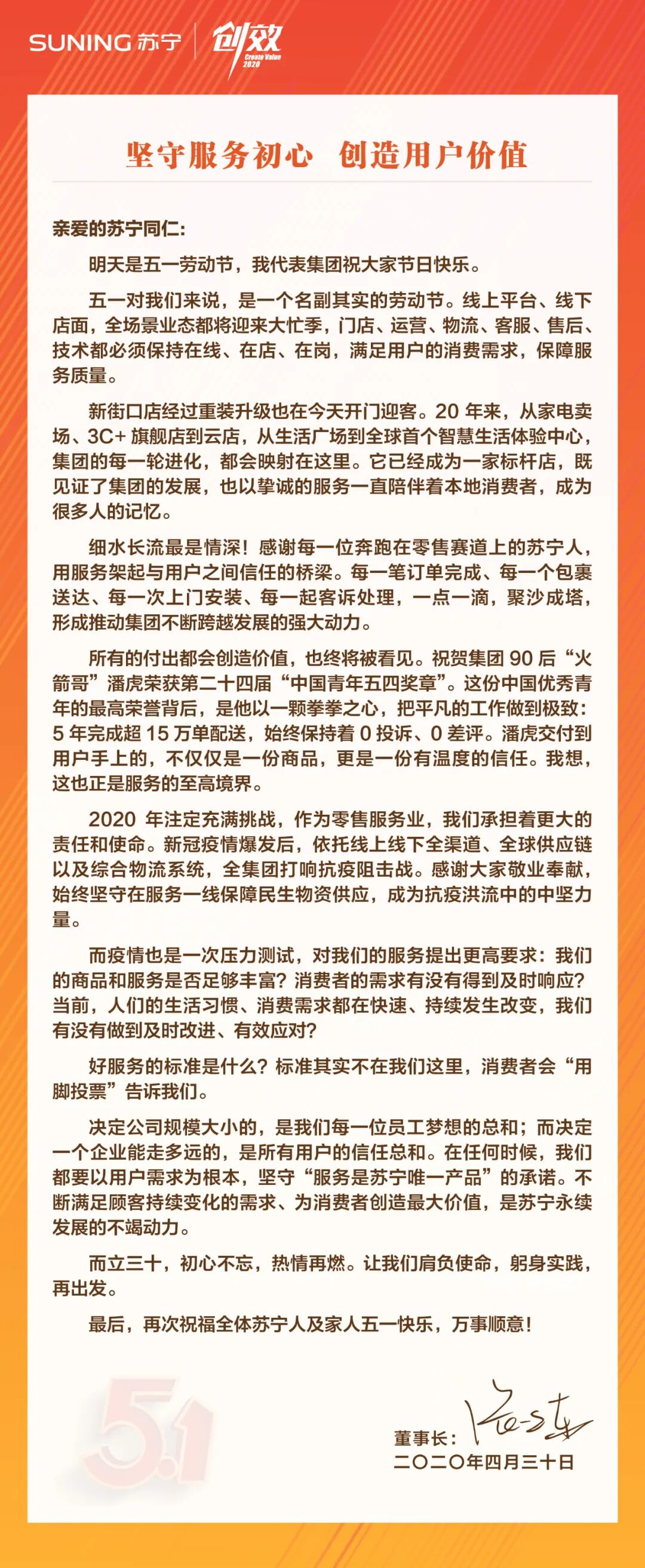 董事长张近东给全体苏宁人的五一致辞