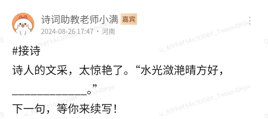 接诗为每周一活动,诗词老师给出上句,诗友们接下句,无过多要求,接出即可。