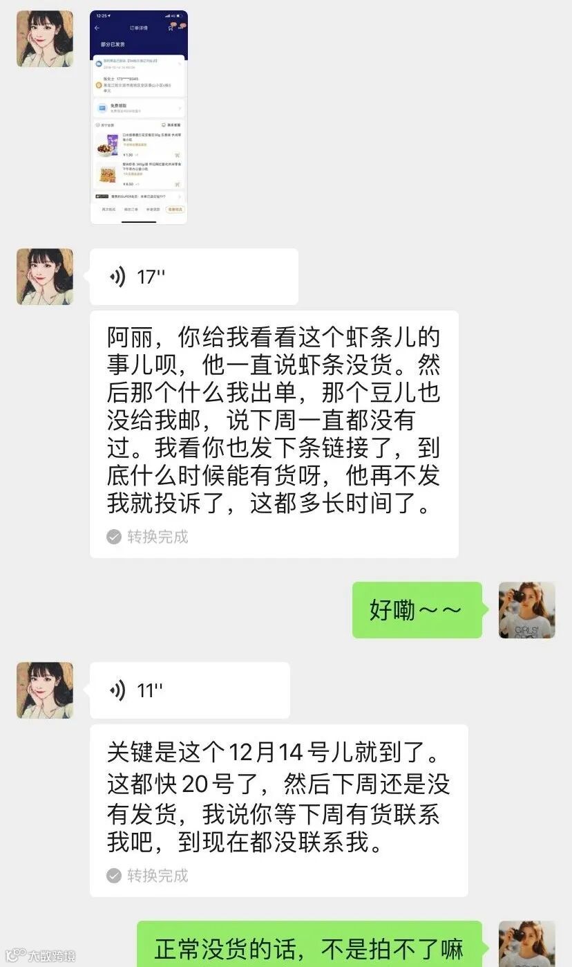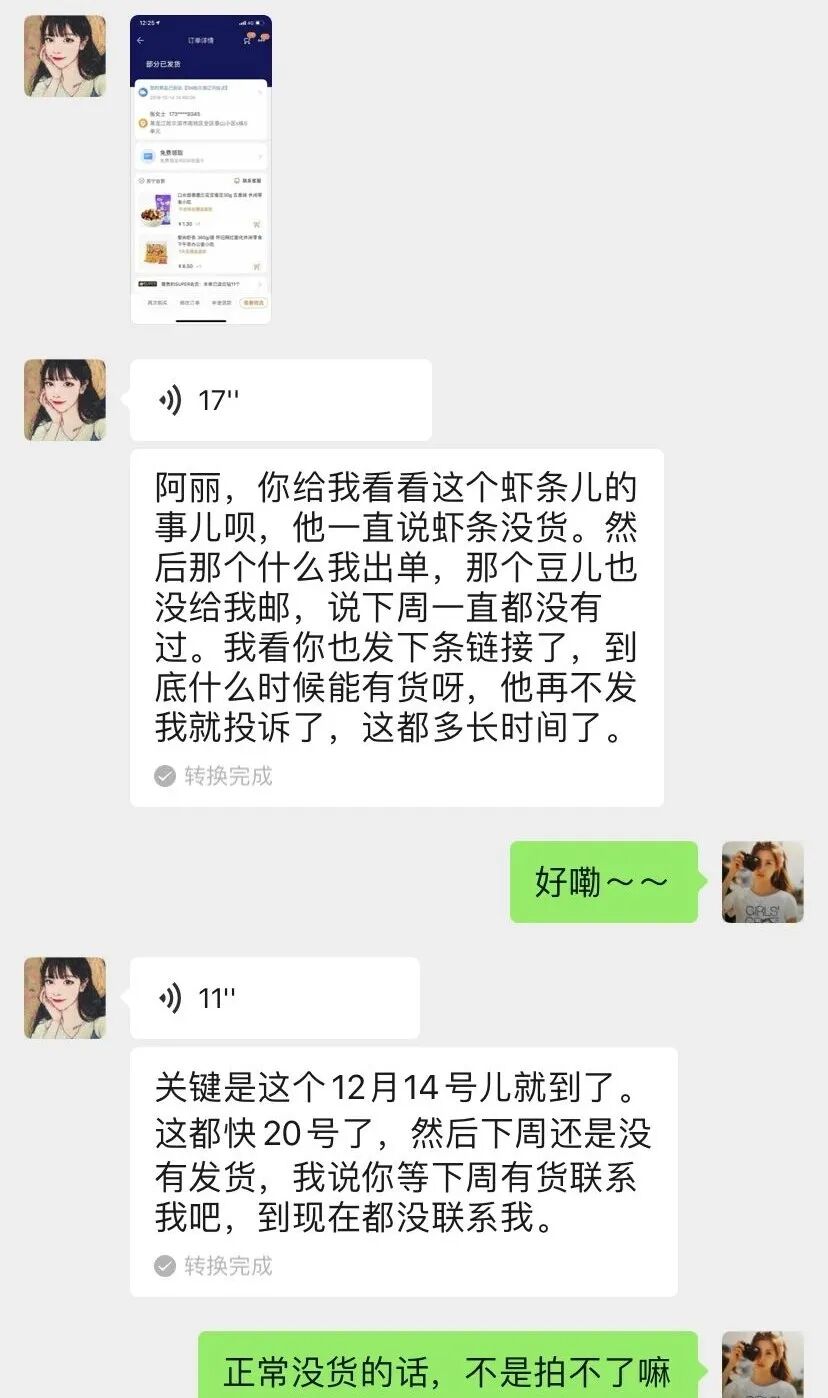 “我四天前在你这里买的零食,怎么还没发货啊”