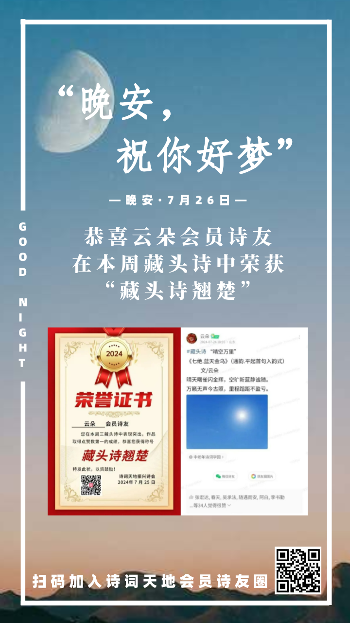 晚安海报丨恭喜云朵会员诗友,在本周藏头诗中荣获“藏头诗翘楚”!