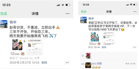 杨华的邻居看中了他发的茅台,就来询价,得益于自己在家乐福工作,他对于同款茅台在行业内的价格有明确的了解,“我推给他的那款茅台在山姆会员店要卖到三千多,而我们只卖两千多,大家都懂酒,所以他就很爽快的就下单了。”