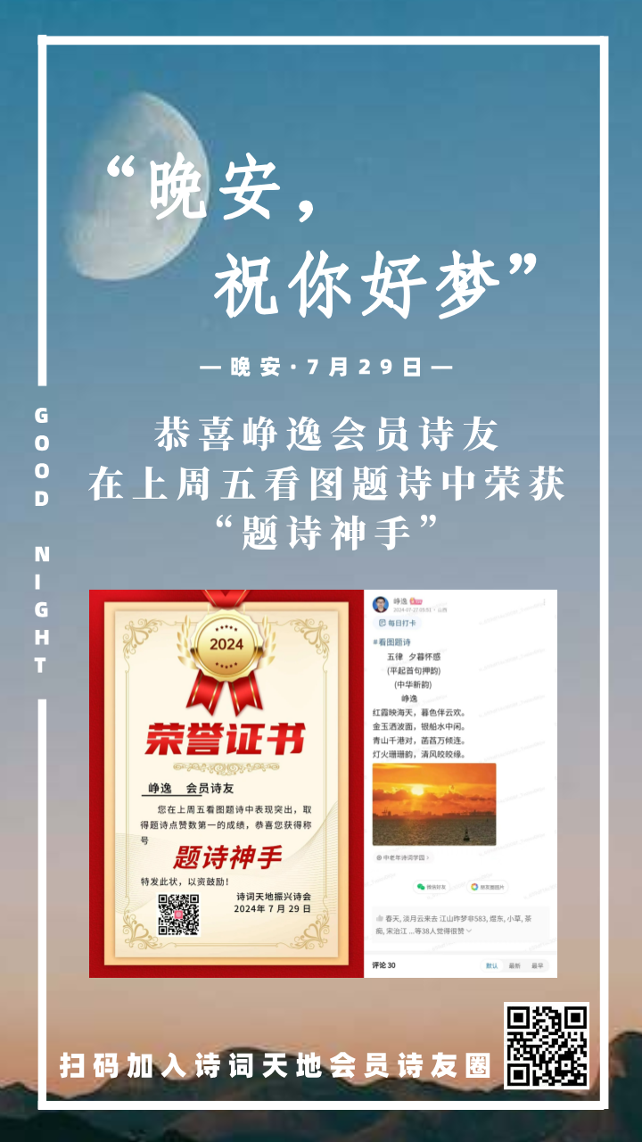 晚安海报丨恭喜峥逸会员诗友,在上周五看图题诗中荣获“题诗神手”!