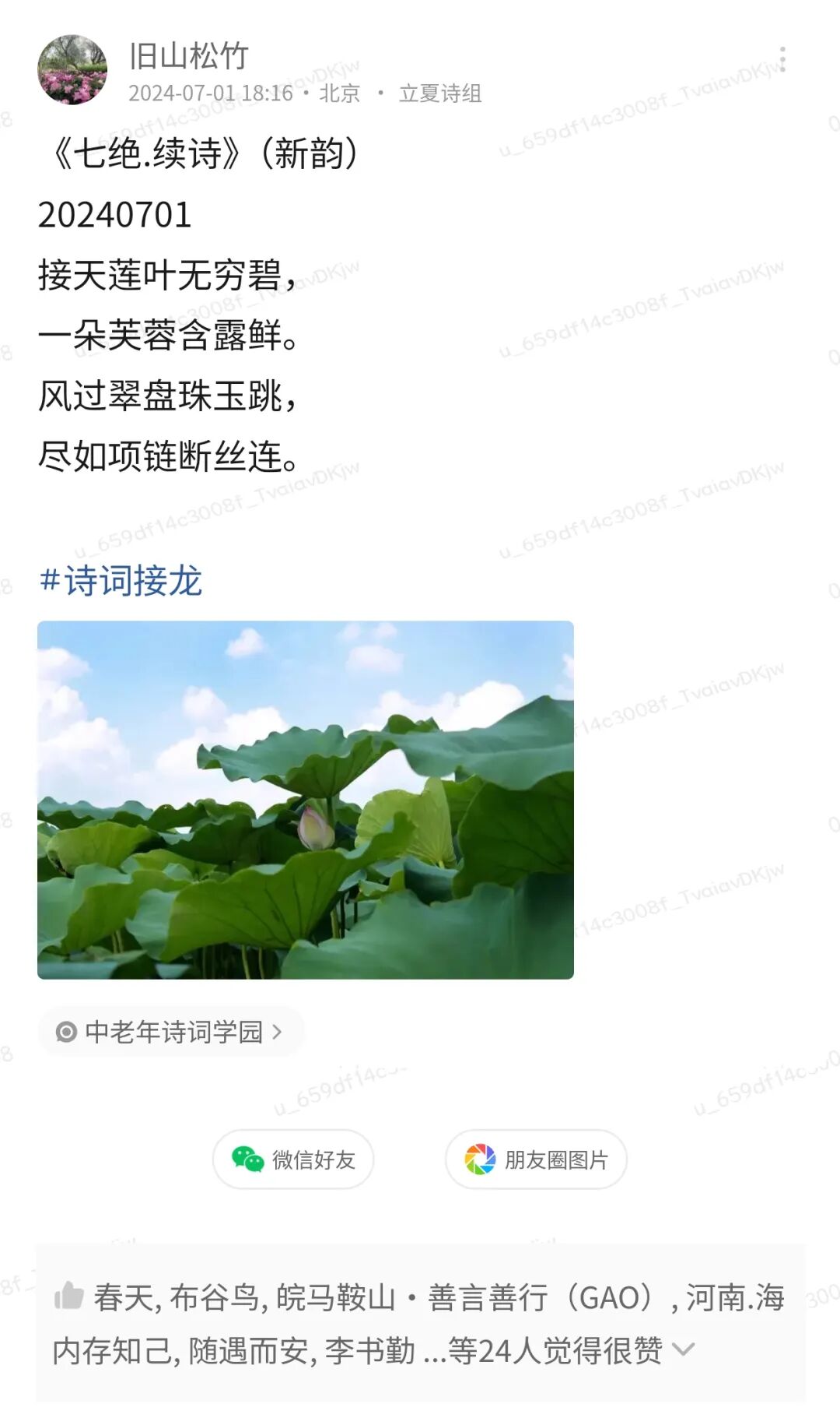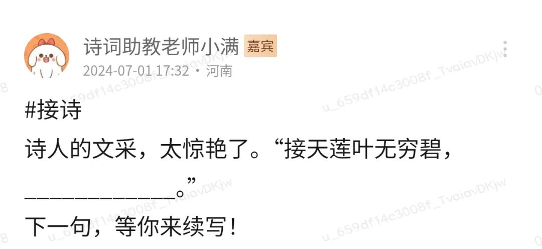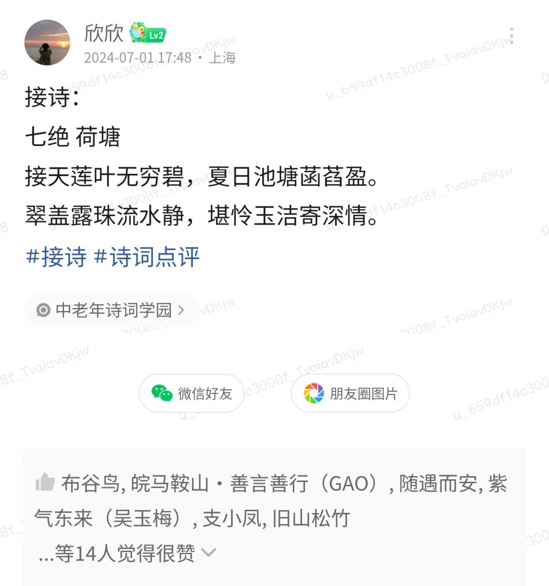 “语尽意未休,断句续佳篇。”接诗活动为“诗词天地会员圈”特有活动,诗友们以独特的视角展现诗词之美,将自己所学所知都展现出来。
