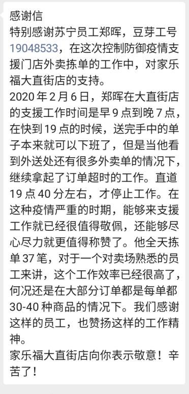郑晖在门店的努力工作大家都看在眼里,国展家乐福大直街店还专门写了一封感谢信对小伙子进行了表扬。