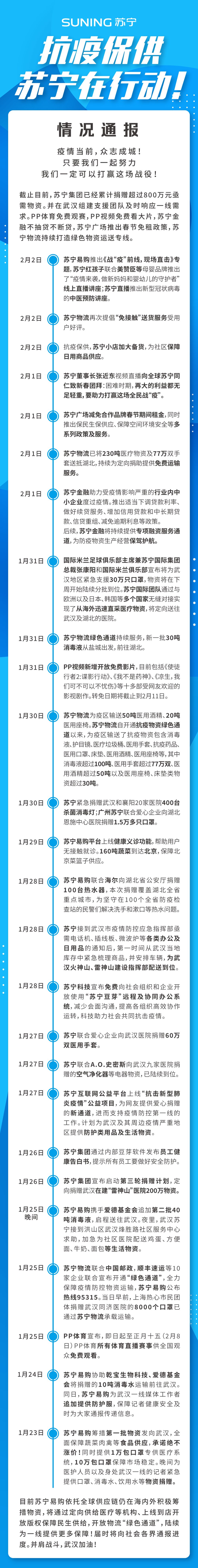 截止目前,苏宁集团已经累计捐赠超过800万元亟需物资。并在武汉组建支援团队及时响应一线需求。PP体育免费观赛,PP视频免费看大片,苏宁金融不抽贷不断贷,苏宁广场推出春节免租政策,苏宁物流持续打造绿色物资运送专线。