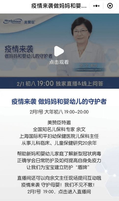 2月2日 苏宁易购推出《战“疫”前线,现场直击》专题,苏宁红孩子联合美赞臣等母婴品牌推出了“疫情来袭,做新妈妈和婴幼儿的守护者”线上直播讲座;苏宁直播推出新型冠状病毒的中医预防讲座。