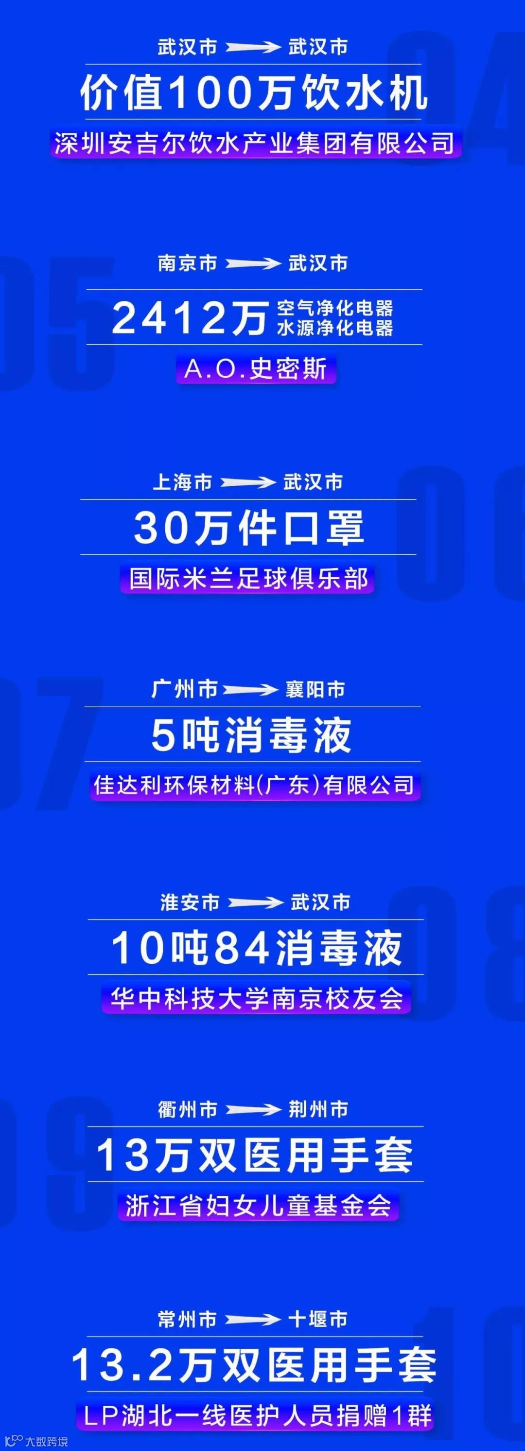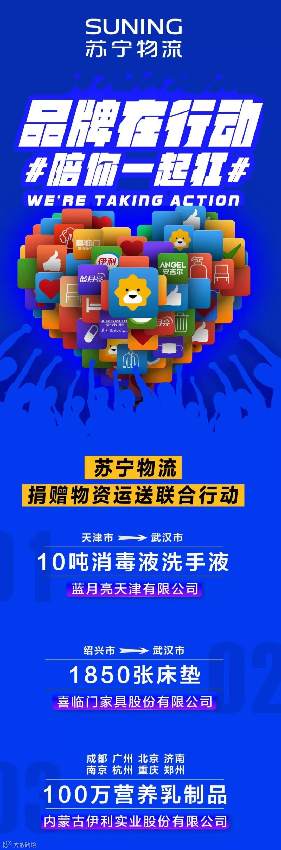 2月7日,苏宁易购宣布正式成立“品牌在行动”专项,联合国内外爱心品牌,打响协同战“疫”。首批“品牌在行动”成员既包括蓝月亮、A.O.史密斯、汉斯希尔等防护物资相关企业,也包括伊利、雀巢、安吉尔等生活物资相关企业,还有苏宁金融、T3出行等金融和服务型企业。数据显示,苏宁易购首批联合行动品牌捐赠物资即达3000万元。