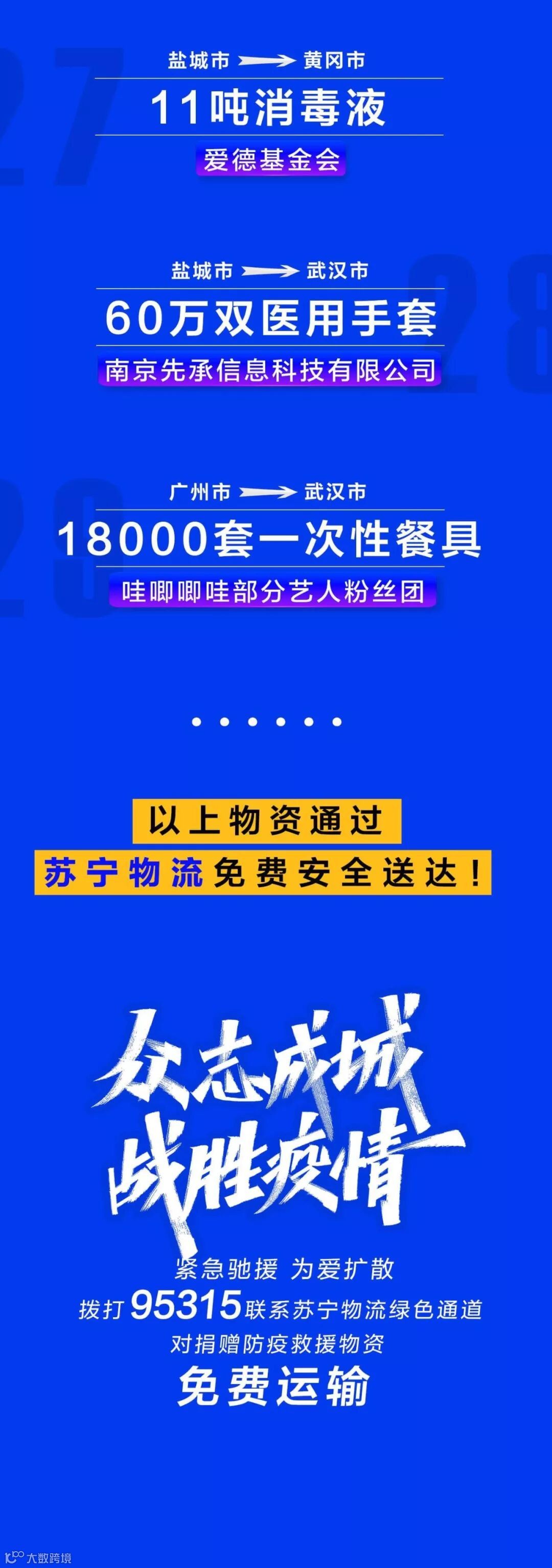 值得一提的是,苏宁承诺,“品牌在行动”中爱心企业捐赠的防护物资、民生物资等,都将由苏宁物流免费安全配送。