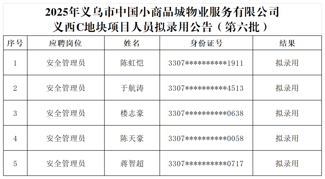 2025年义乌市中国小商品城物业服务有限公司义西C地块项目人员拟录用公告(第六批)