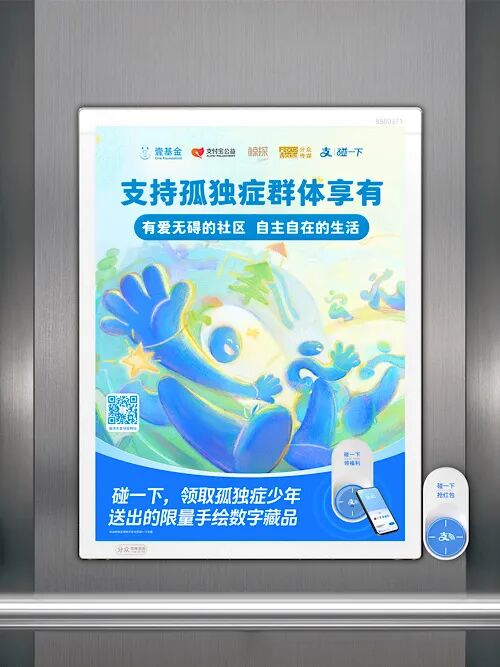 今年“中华慈善日”期间,用户在电梯里“碰一下”分众传媒的公益海报,就能领取一份由“壹基金海洋天堂计划”受益孤独症少年手绘画作定制的鲸探数字藏品,公益传播从“被动观看”转为“主动体验”。