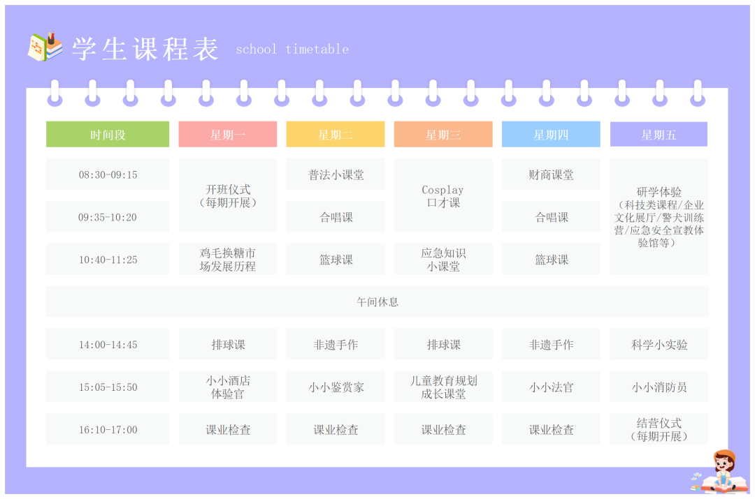 课业检查将通过有趣的方式帮助孩子们巩固和提升学习成绩,在暑假期间不掉队!同时准备了一系列体育挑战和锻炼,让孩子们身体更强壮、更健康。此外,还有“小小家”职业体验课程,让孩子们体验不同职业的真实的工作场景,培养实用的职业技能。不仅如此,我们还精心设计了特色研学课程,让孩子们走出课堂,亲身感受科学、艺术、文化等领域的魅力,以此不断拓宽视野,开拓思维,激发创造力!