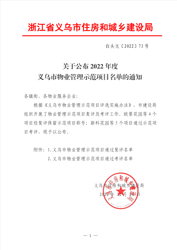 在2022年度义乌市物业管理示范项目评选中,我司 荷塘月色小区 顺利通过“义乌市物业管理示范项目”考评。