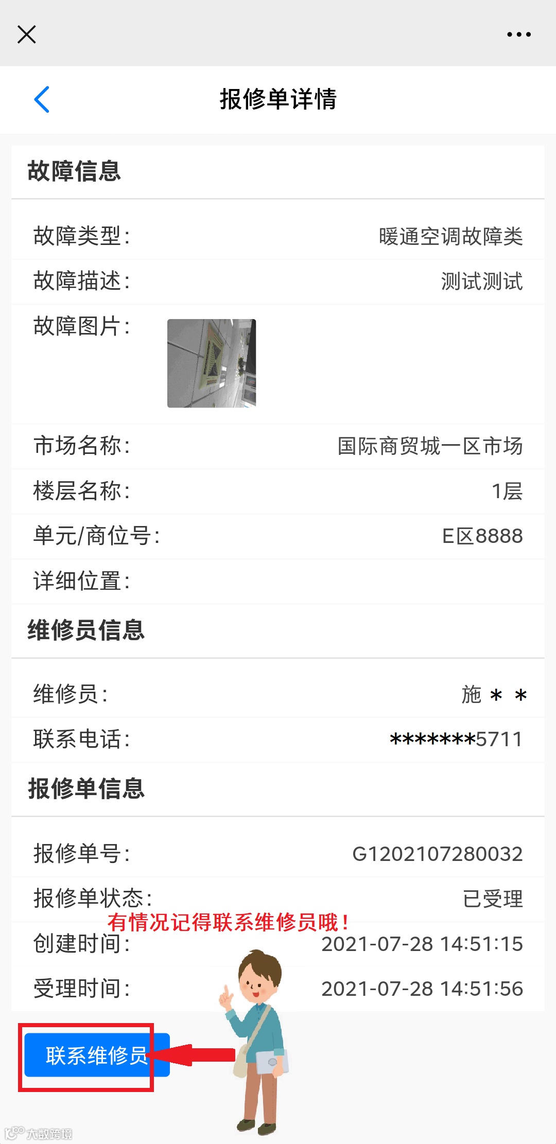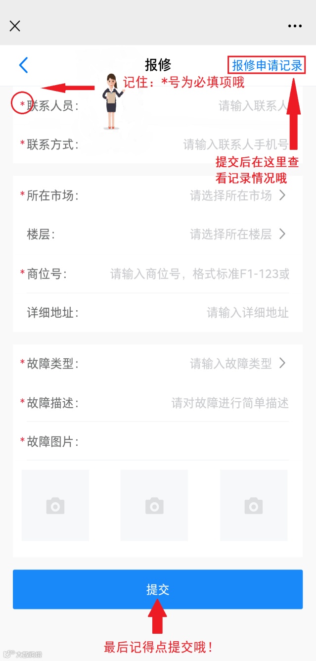 表单中输入相关报修信息(注:带 * 号为必填项哦!),完成后点击提交。