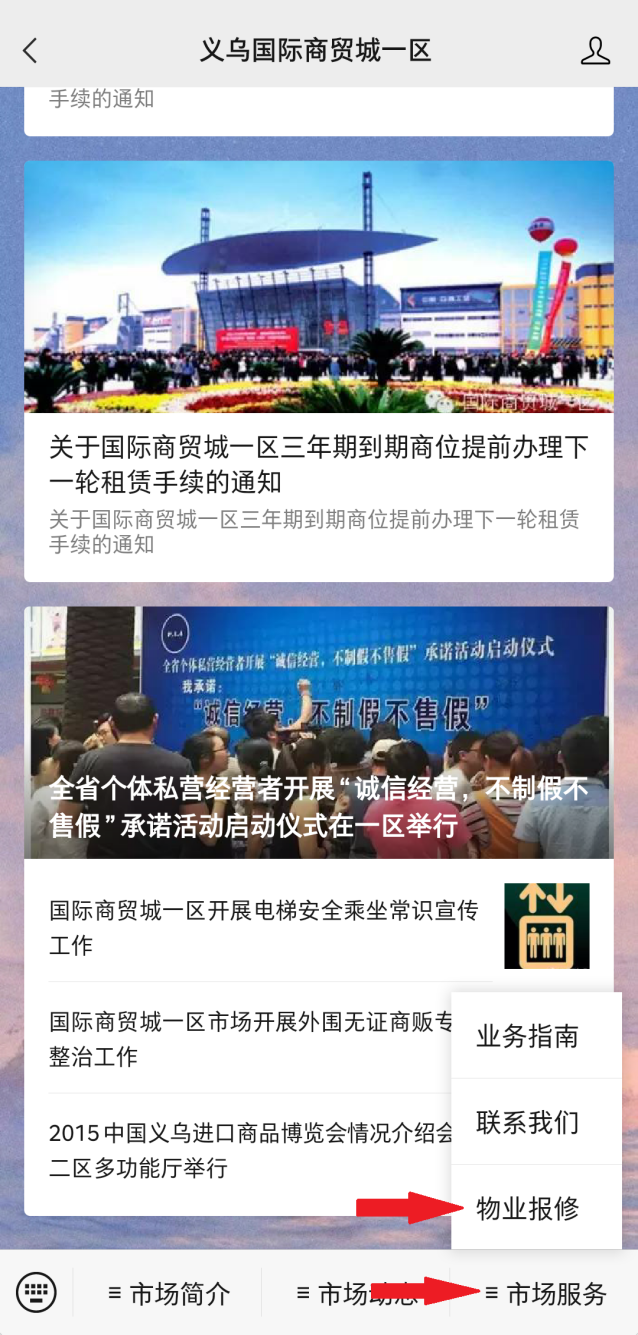 点开我们商城一区公众号,市场服务模块下选择物业报修。