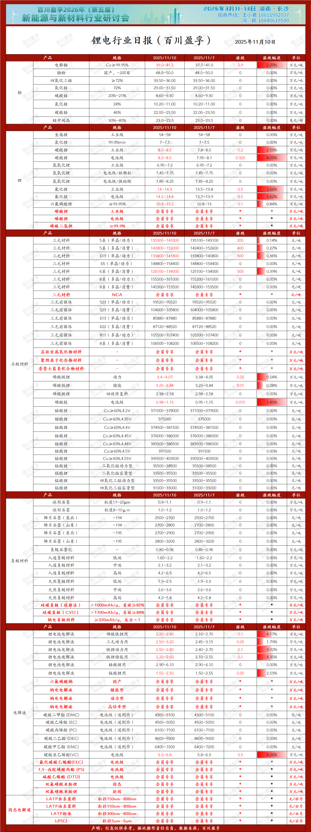 百川盈孚 | 2025年11月10日锂电行业日报 百川盈孚大宗商品参考价格发布