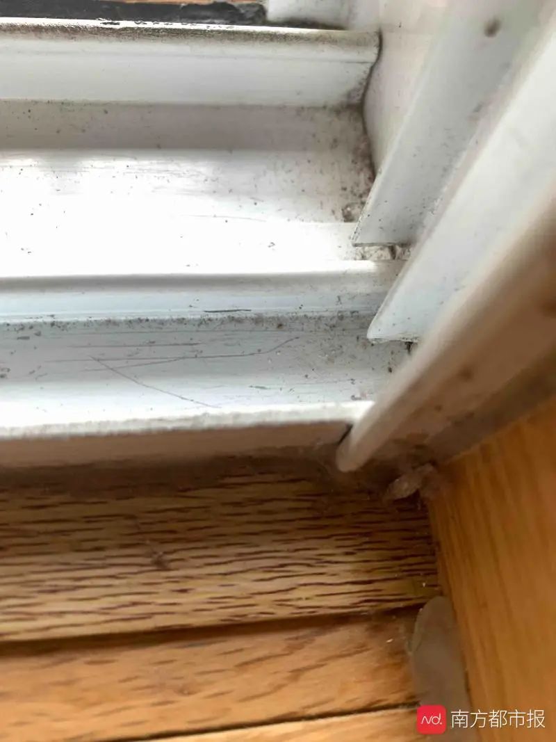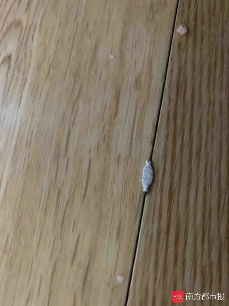 在冯先生家中,记者注意到几乎每个房间的墙角都能看到几只类似的虫,喜欢悬挂在接近地脚线位置的墙角,或蜷缩在木地板缝隙。大一点的虫连同袋子,大概有一厘米长,小一点的虫甚至只有针尖大小,乍一看如脱落的白色粉灰,不打着手电筒仔细看,根本无法注意到。