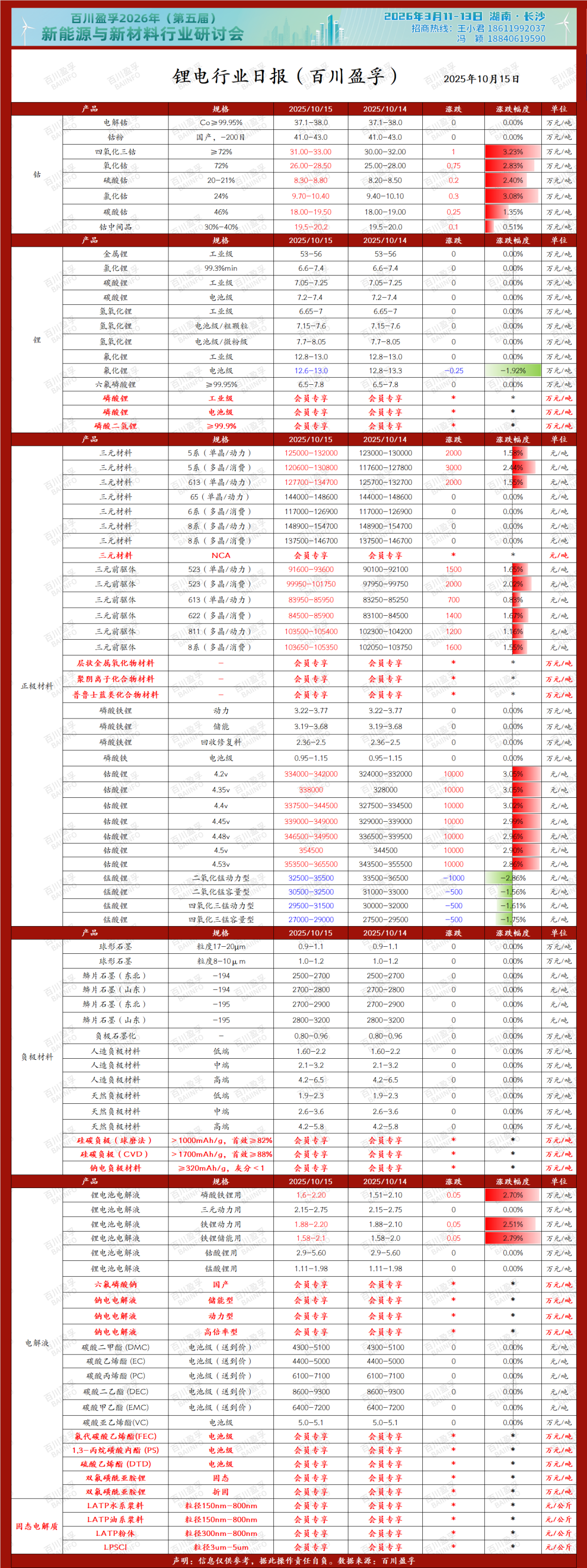 百川盈孚 | 2025年10月15日锂电行业日报 百川盈孚大宗商品参考价格发布