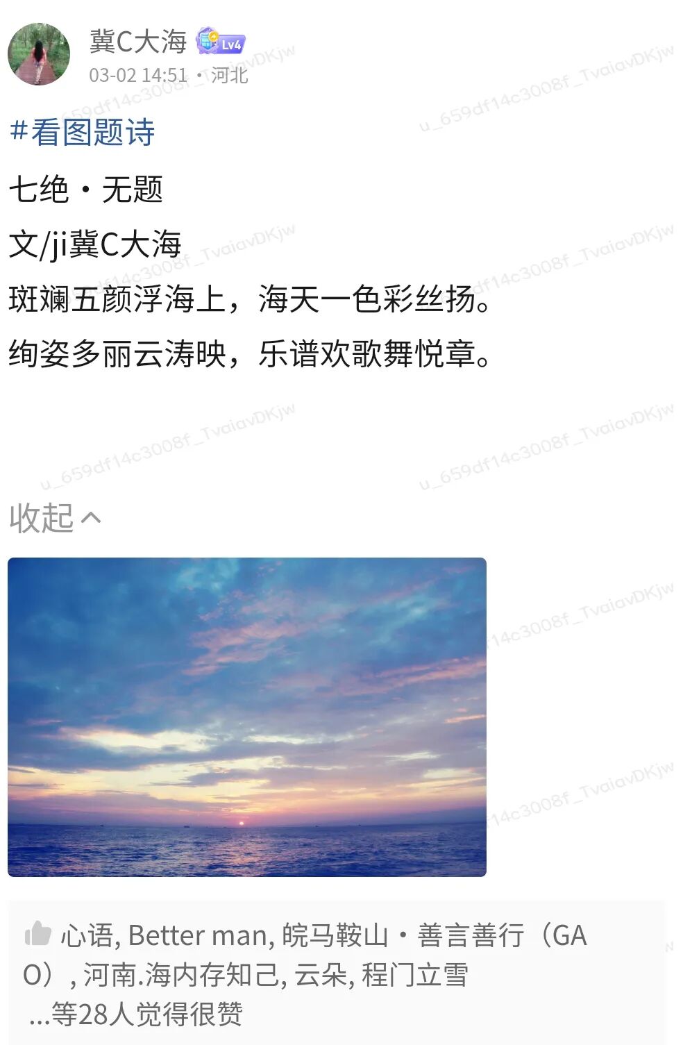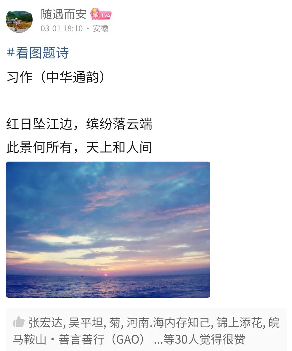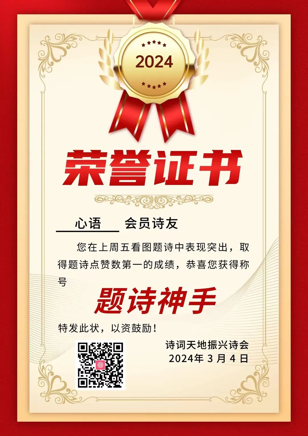 恭喜心语会员诗友,在上周五看图题诗取得点赞数第一的成绩,获得称号“题诗神手“。