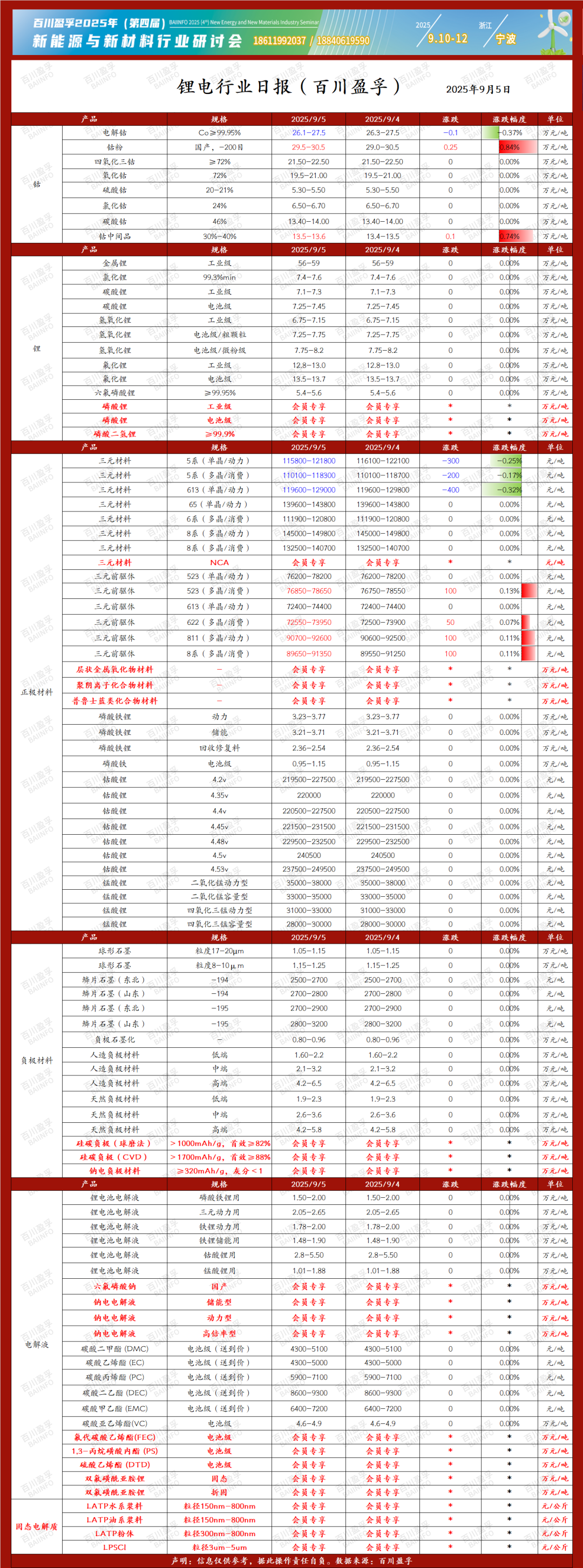 百川盈孚 | 2025年9月5日锂电行业日报 百川盈孚大宗商品参考价格发布