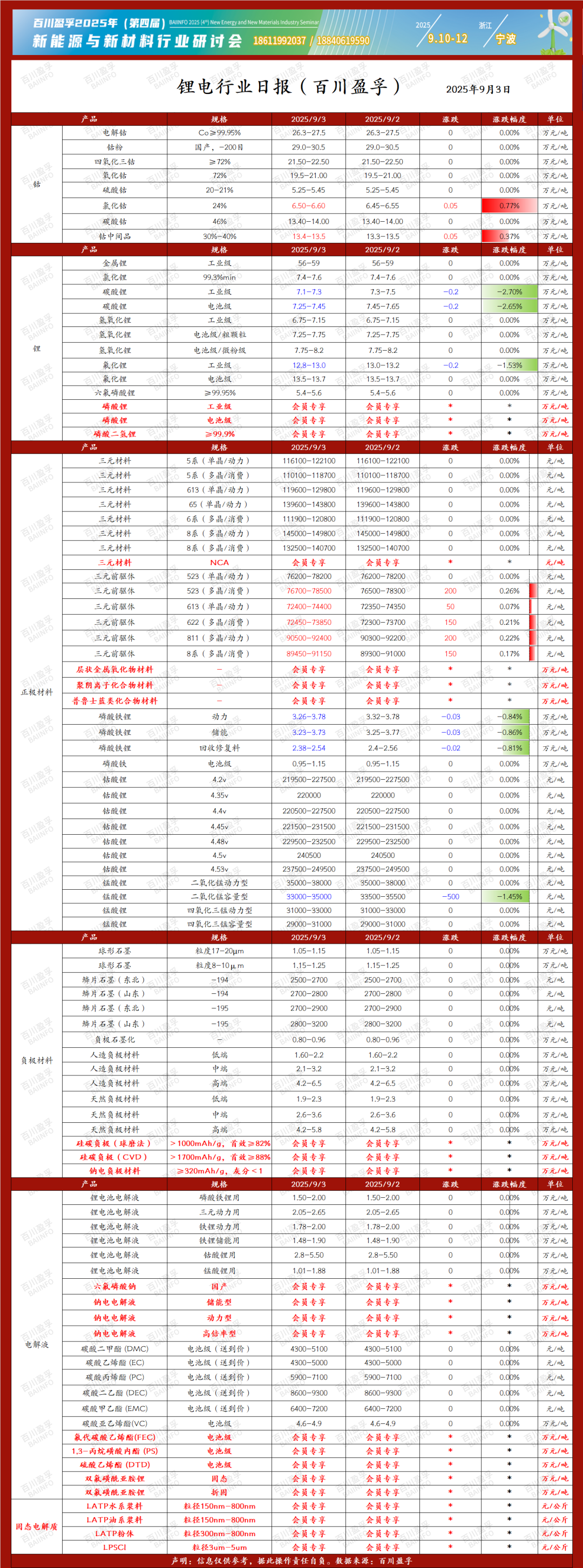 百川盈孚 | 2025年9月3日锂电行业日报 百川盈孚大宗商品参考价格发布