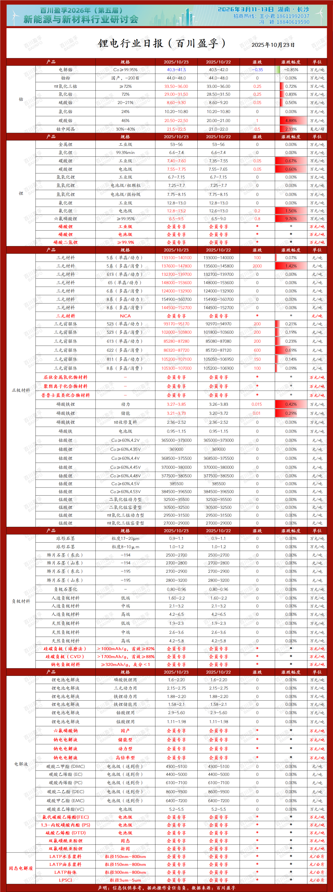 百川盈孚 | 2025年10月23日锂电行业日报 百川盈孚大宗商品参考价格发布