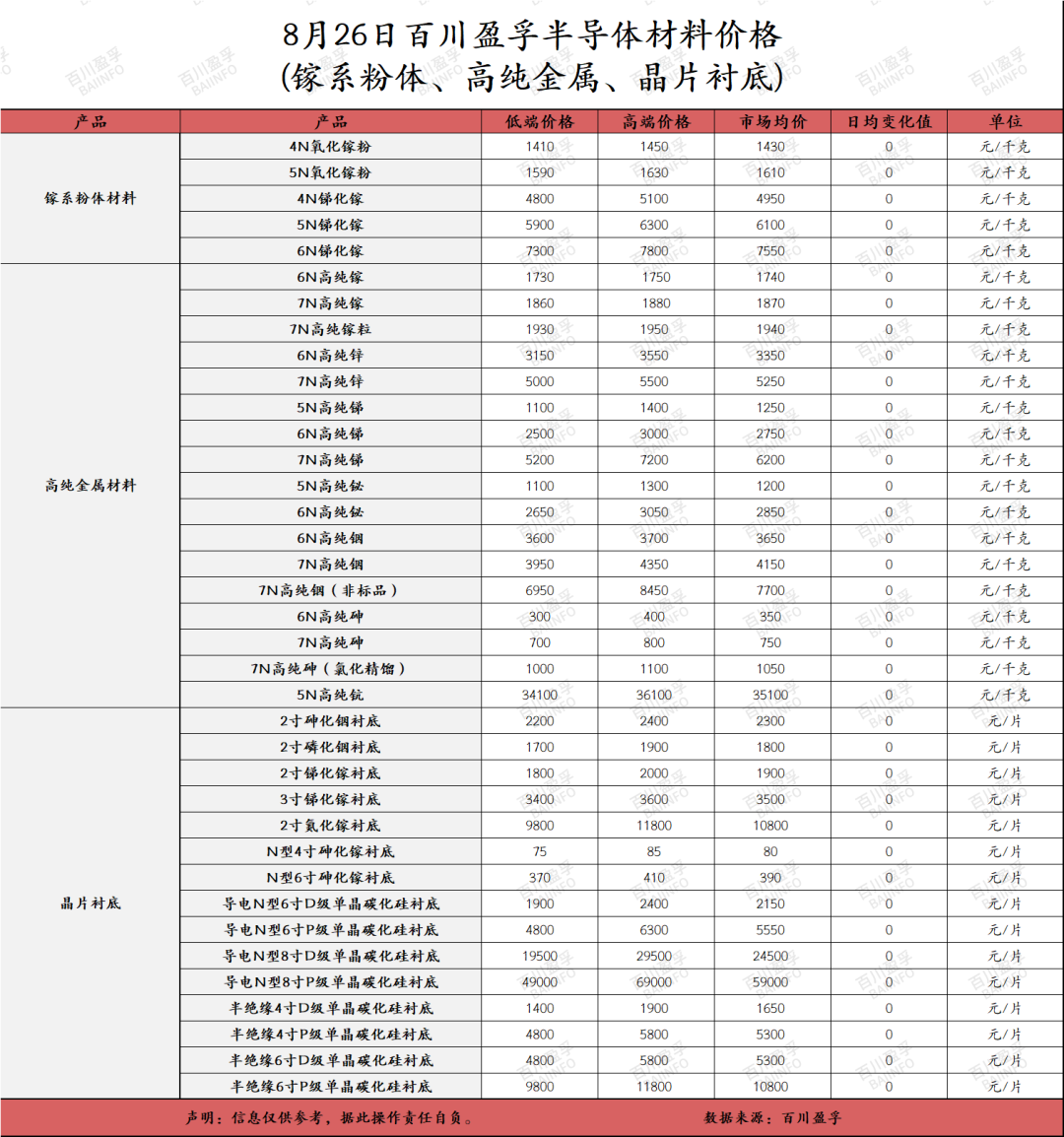 百川盈孚 | 2025年8月26日半导体材料价格 百川盈孚大宗商品参考价格发布