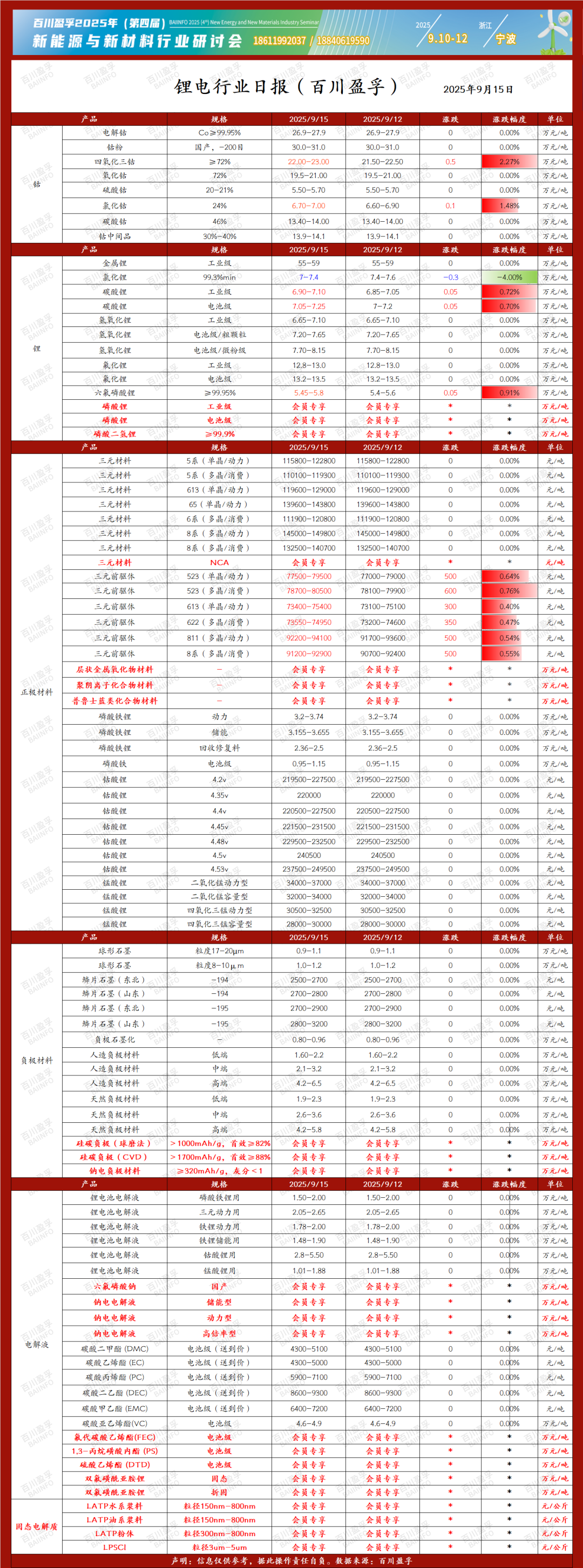 百川盈孚 | 2025年9月15日锂电行业日报 百川盈孚大宗商品参考价格发布