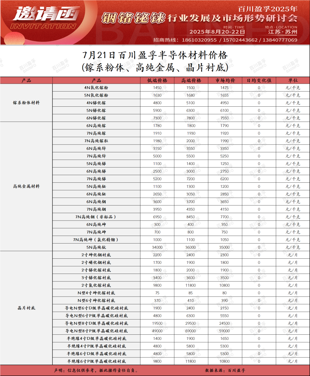 百川盈孚 | 2025年7月21日半导体材料价格 百川盈孚大宗商品参考价格发布