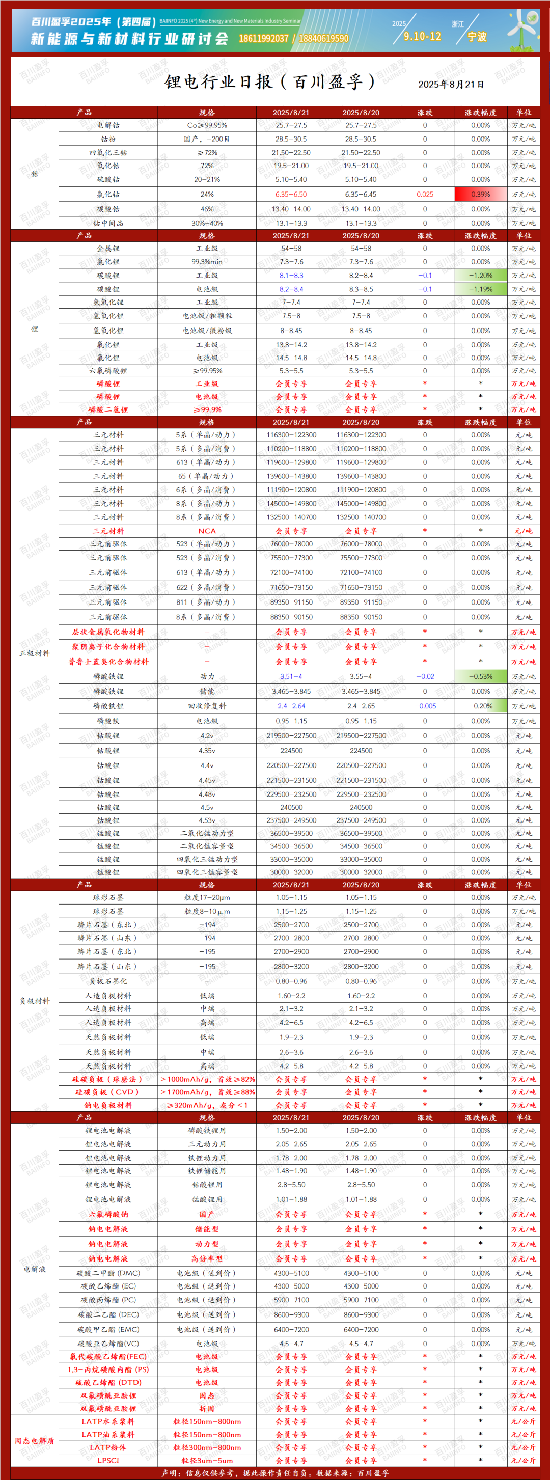 百川盈孚 | 2025年8月21日锂电行业日报 百川盈孚大宗商品参考价格发布