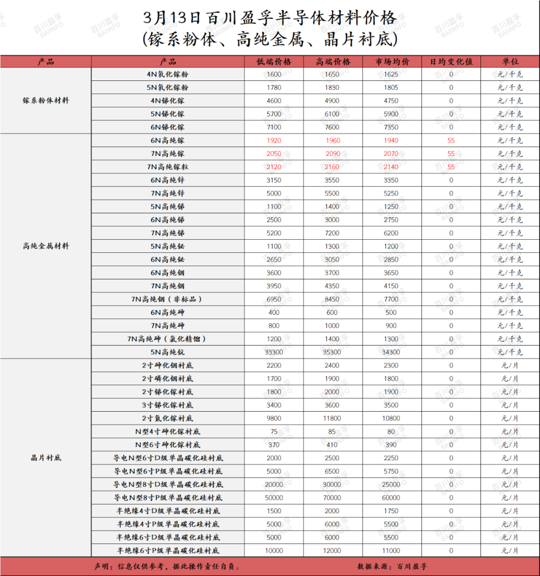 百川盈孚 | 2025年3月13日半导体材料价格 百川盈孚大宗商品参考价格发布