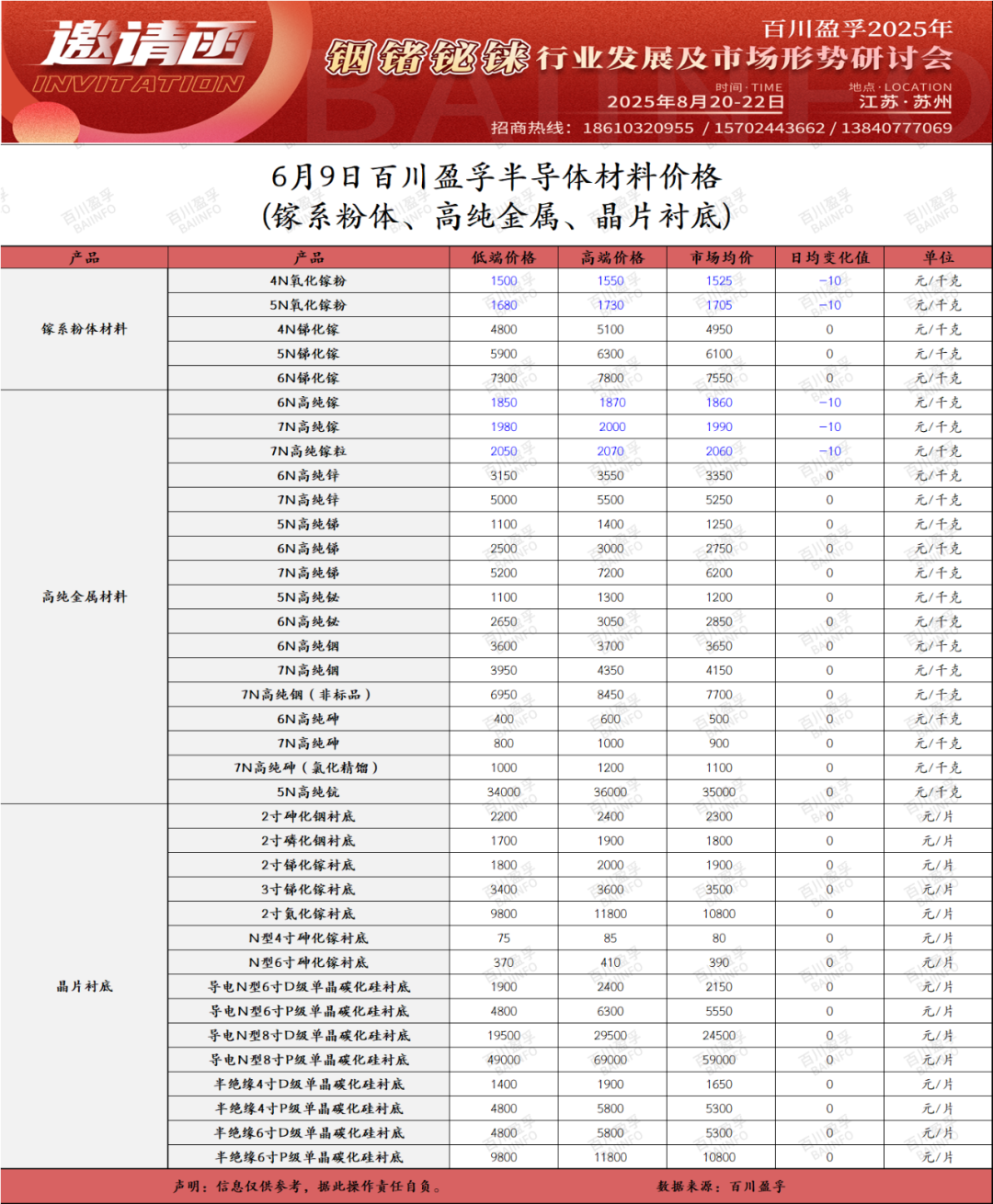 百川盈孚 | 2025年6月9日半导体材料价格 百川盈孚大宗商品参考价格发布