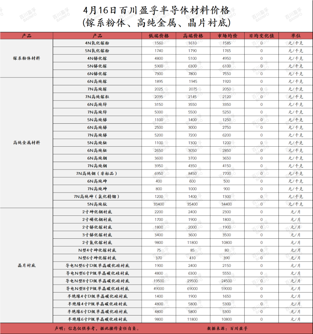 百川盈孚 | 2025年4月16日半导体材料价格 百川盈孚大宗商品参考价格发布