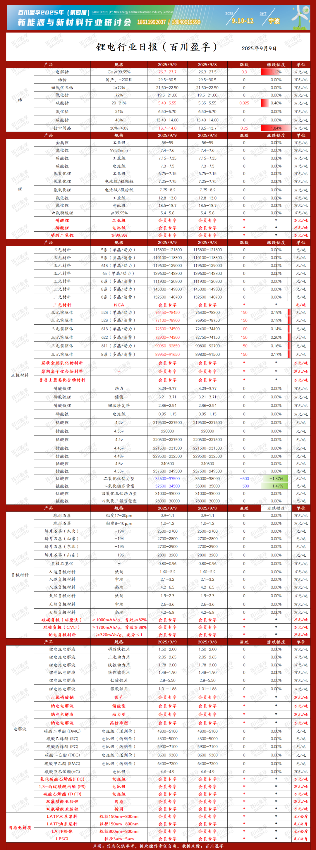 百川盈孚 | 2025年9月9日锂电行业日报 百川盈孚大宗商品参考价格发布