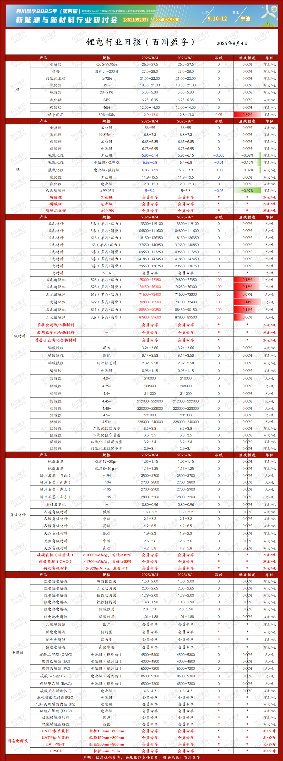 百川盈孚 | 2025年8月4日锂电行业日报 百川盈孚大宗商品参考价格发布