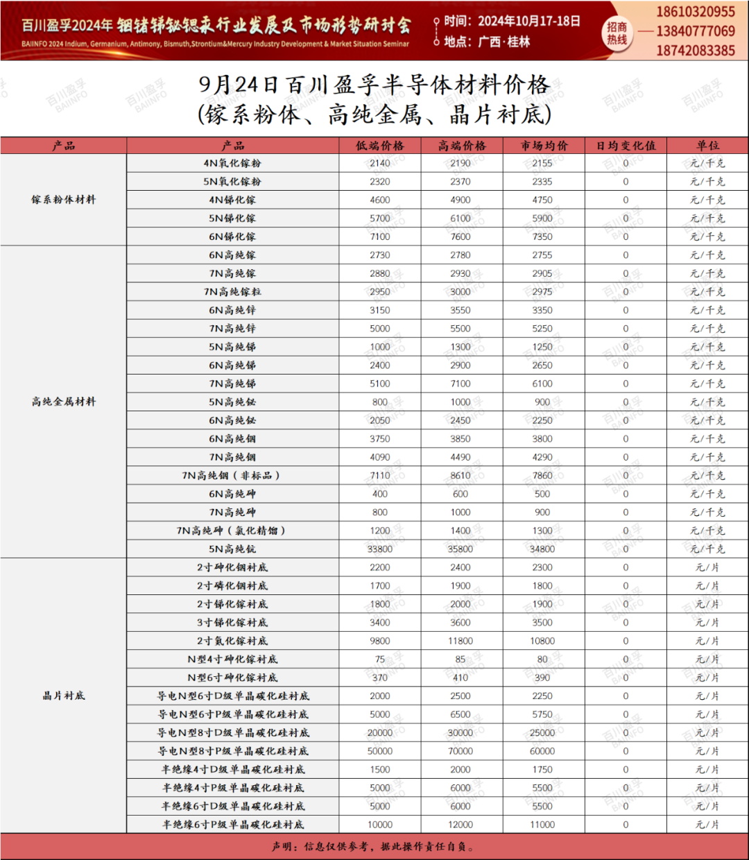 百川盈孚 | 2024年9月24日半导体材料价格 百川盈孚大宗商品参考价格发布