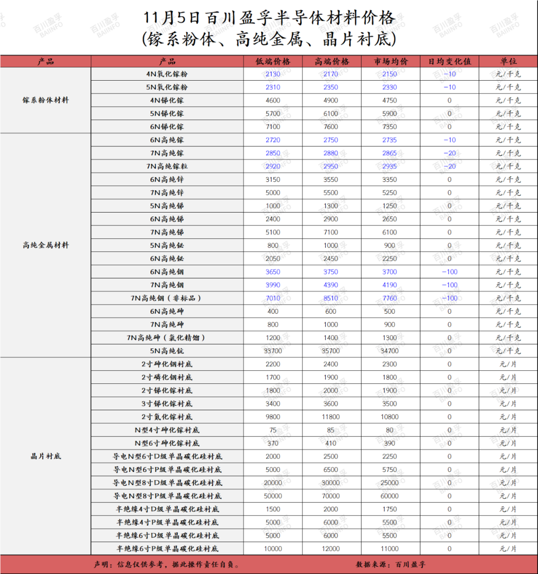 百川盈孚 | 2024年11月5日半导体材料价格 百川盈孚大宗商品参考价格发布