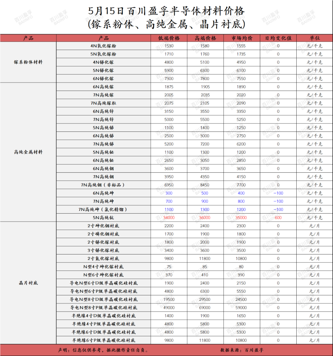 百川盈孚 | 2025年5月15日半导体材料价格 百川盈孚大宗商品参考价格发布