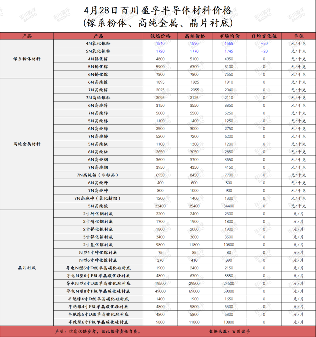 百川盈孚 | 2025年4月28日半导体材料价格 百川盈孚大宗商品参考价格发布