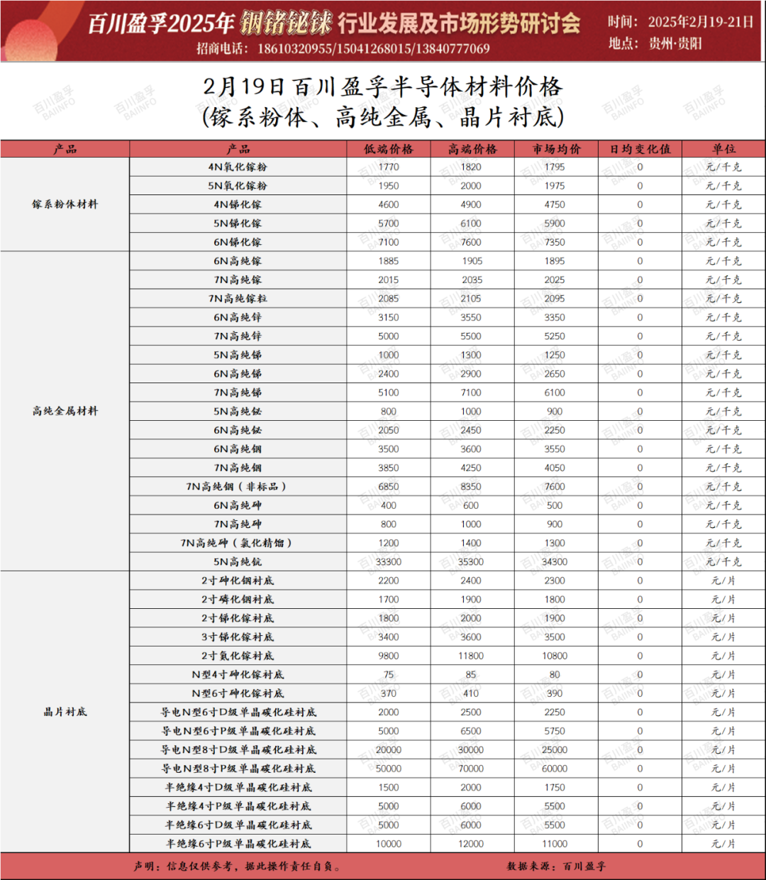百川盈孚 | 2025年2月19日半导体材料价格 百川盈孚大宗商品参考价格发布