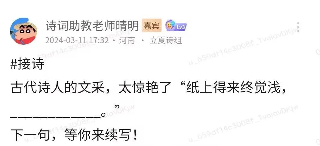 “语尽意未休,断句续佳篇。”接诗活动为“诗词天地会员圈”特有活动,诗友们以独特的视角展现诗词之美,将自己所学所知都展现出来。