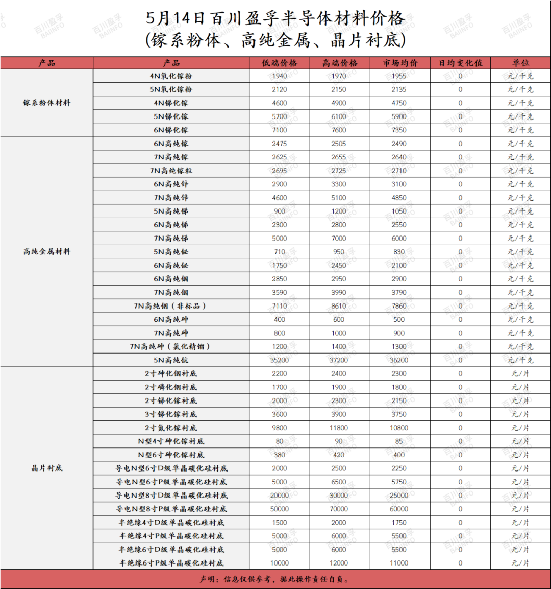 百川盈孚 | 2024年5月14日半导体材料价格 百川盈孚大宗商品参考价格发布