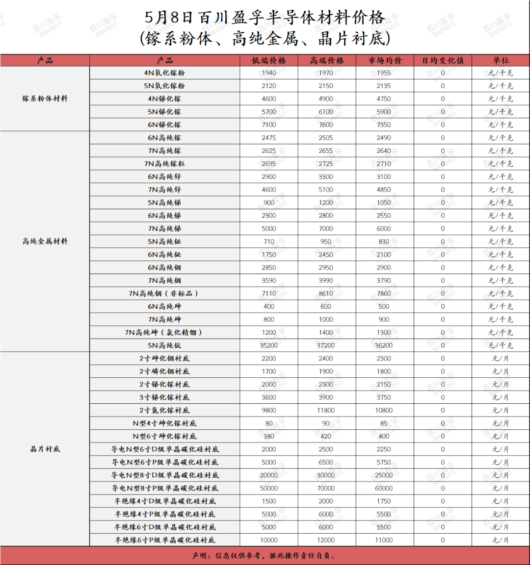 百川盈孚 | 2024年5月8日半导体材料价格 百川盈孚大宗商品参考价格发布