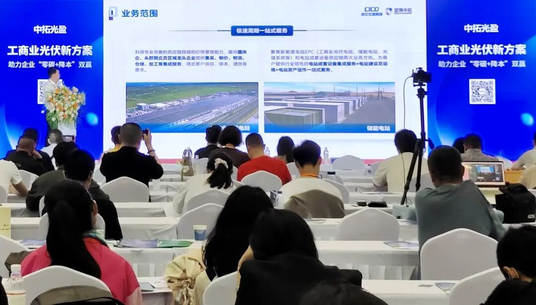 张朝洲重点介绍了中拓光盈工商业光伏解决方案。该方案聚焦于产业园区、工业企业以及大型公共建筑等应用场景,为客户提供涵盖光伏贸易、工程设计、EPC总包及智慧运维等一站式集成服务方案。目前,光储充行业处于关键发展期,其上、中、下游产业链的贸易、服务、建设与投资等领域均存在巨大发展空间。而中拓光盈凭借在新能源全产业链各环节的深厚积累,具备显著优势,未来将持续为光储充产业提供“降本增效”的优质解决方案,助力企业实现“零碳与降本”双赢,携手共建绿色能源新生态,推动行业高质量可持续发展。